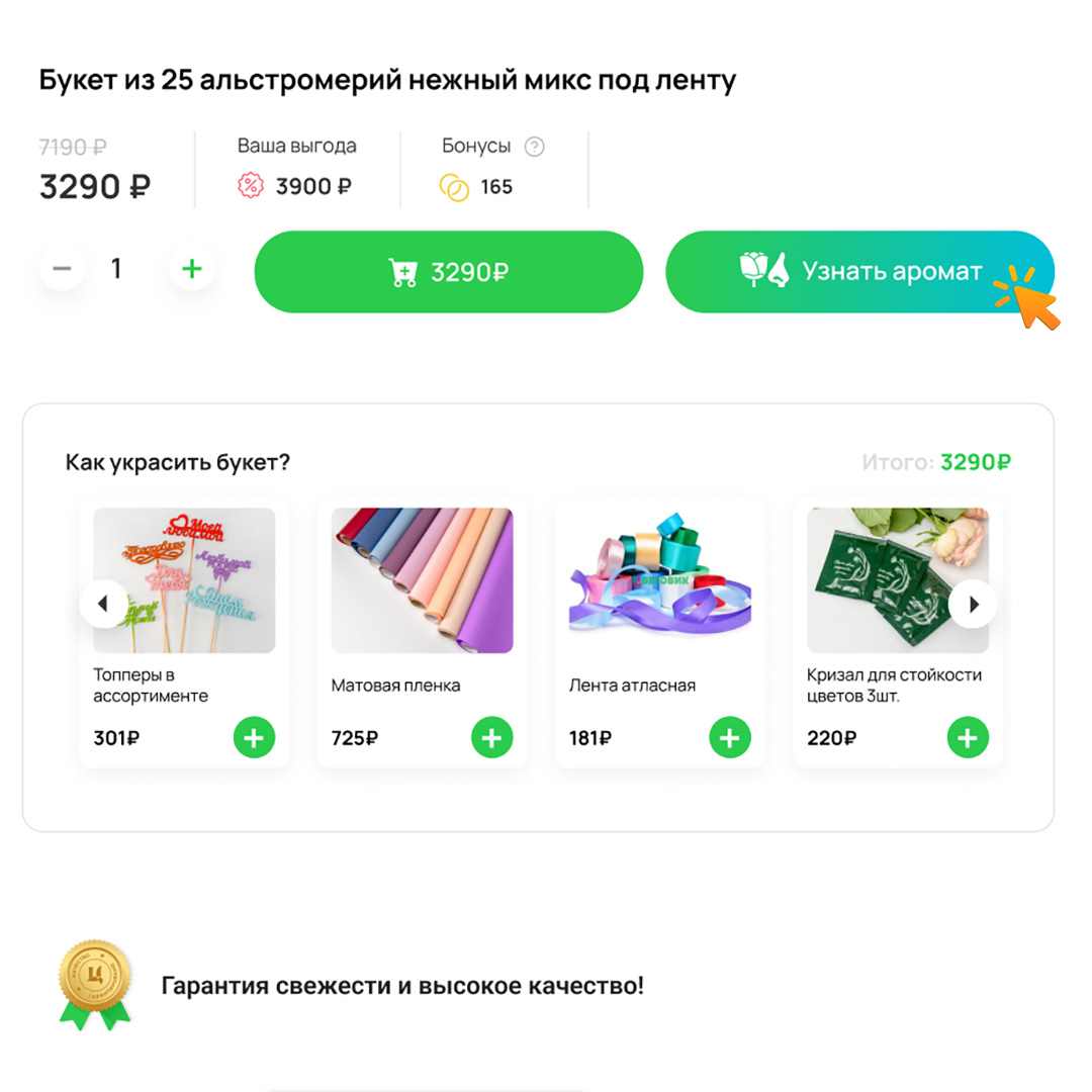 На сайте «Цветовик» теперь у каждого букета есть описание его аромата. Вы можете заранее понять: будет ли запах ярким или едва заметным, сладким или свежим, нежным или пряным. Это поможет выбрать букет, который точно понравится получателю и создаст правильное настроение.