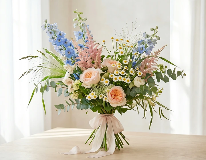 В таких работах прекрасно смотрятся дельфиниумы, тянущиеся вверх, пушистая астильба, игривая ромашка-матрикария и раскидистые ветви эвкалипта. Это идеальный выбор для тех, кто хочет подарить ощущение загородного спокойствия посреди шумного мегаполиса.