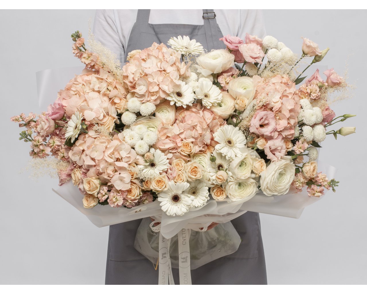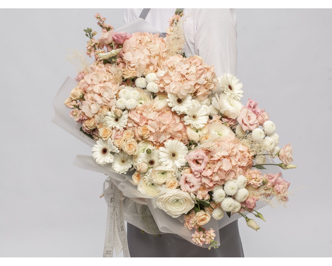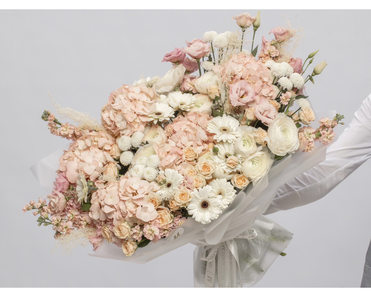 Состав: гортензия 5 шт., гербера мини 10 шт., лизиантус 10 шт., хризантема куст. 10 шт., ранункулюс 10 шт., маттиола 10 шт., роза куст. Кения 70 см 3 шт., стабилизированные цветы 1 шт., пленка 5 шт., лента 2 шт.