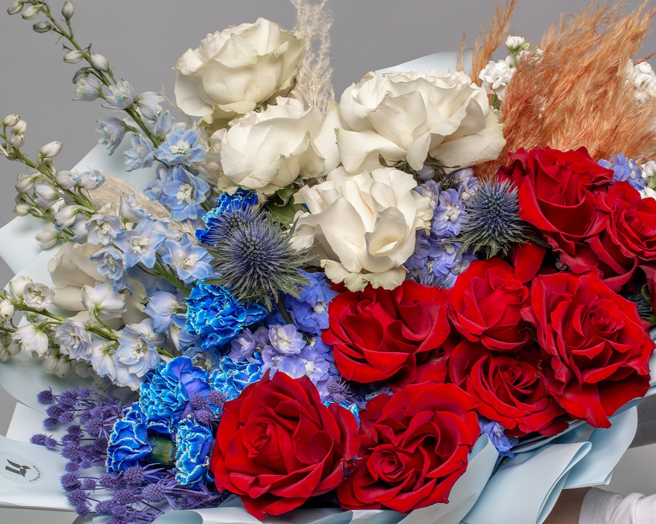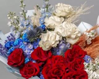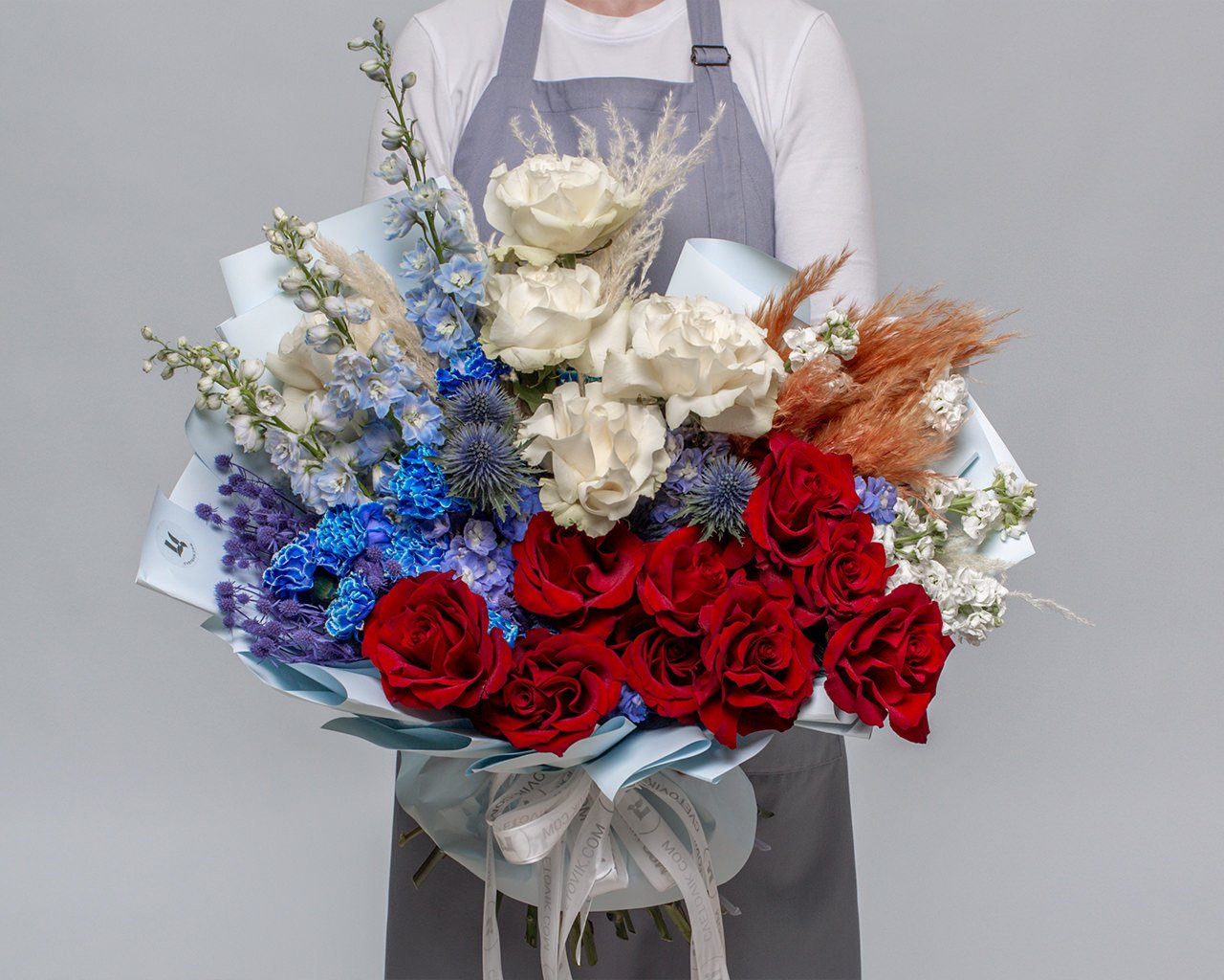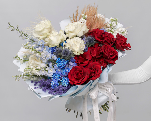 Состав: роза Премиум 40-50 см 13 шт., гвоздика 10 шт., маттиола 5 шт., дельфиниум 7 шт., эрингиум 3 шт., кортадерия 1 шт., сухоцветы (банч) 1 шт., пленка 3 шт., лента 2 шт.
