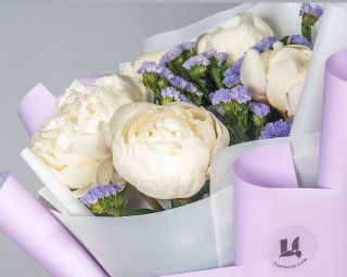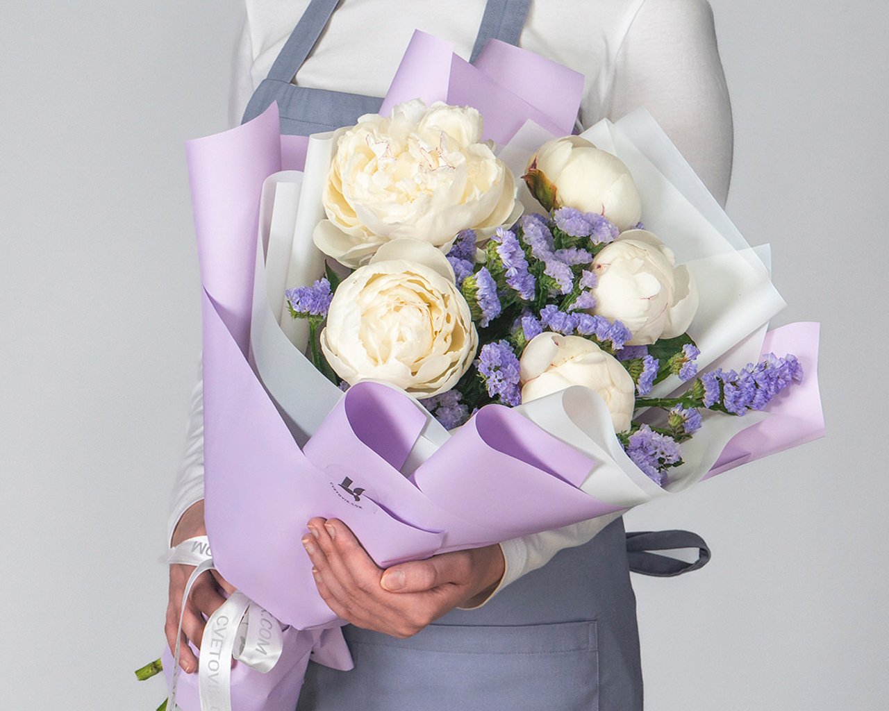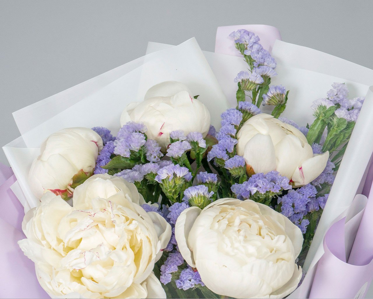Состав: пионы 5 шт., статица 4 шт., пленка 2 шт., лента 1 шт.