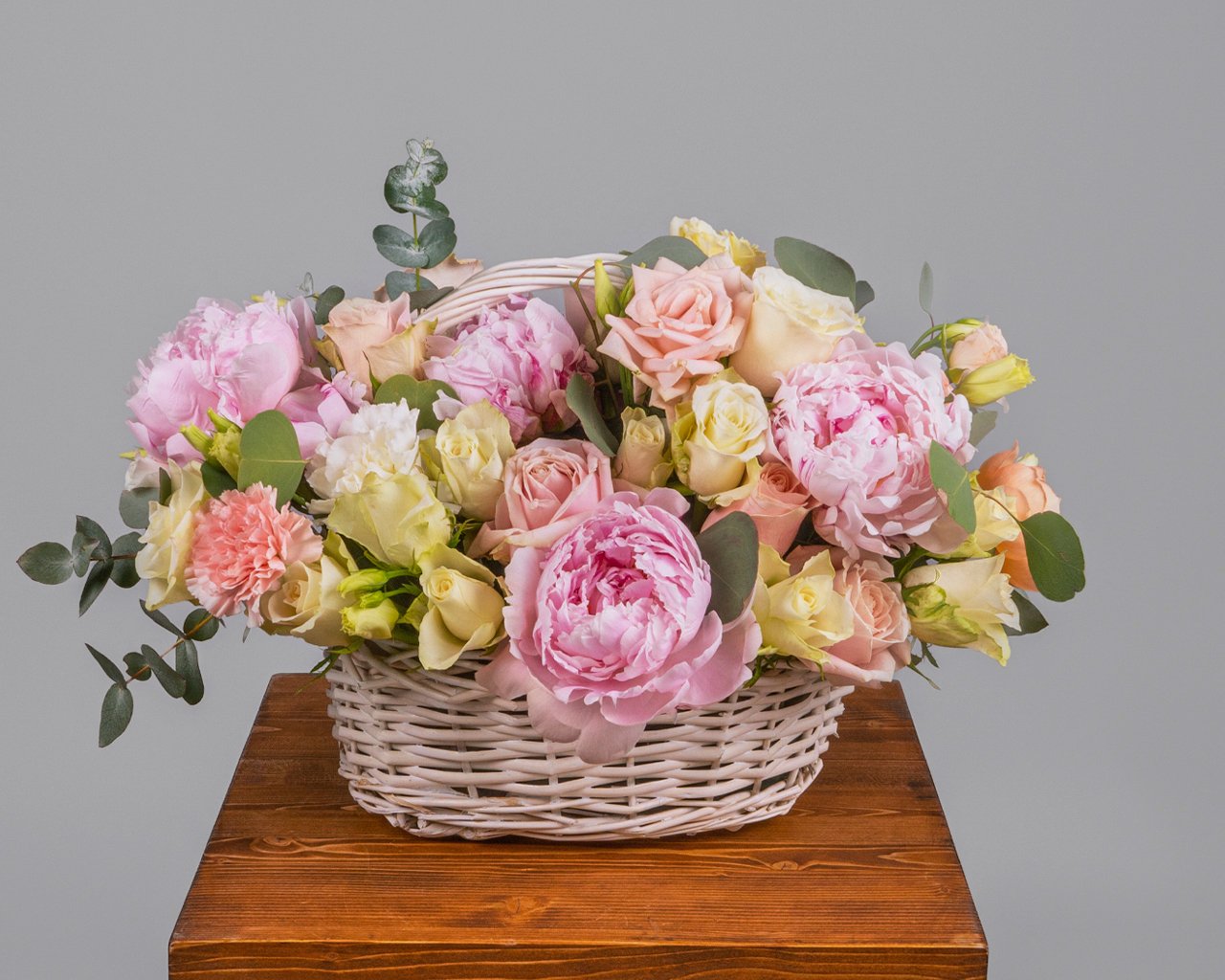 Состав: пионы 7 шт., гвоздика 5 шт., лизиантус 3 шт., роза Кения 35-40 см 15 шт., роза Россия 35-40 см 7 шт., садовая роза 2 шт., корзина 1 шт., оазис 1,5 шт., пленка 1 шт.