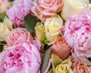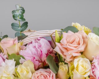 Состав: пионы 7 шт., гвоздика 5 шт., лизиантус 3 шт., роза Кения 35-40 см 15 шт., роза Россия 35-40 см 7 шт., садовая роза 2 шт., корзина 1 шт., оазис 1,5 шт., пленка 1 шт.
