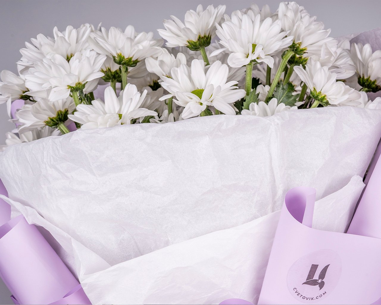 Состав: хризантема кустовая 5 шт, пленка 1,5 шт, лента 1 шт.
