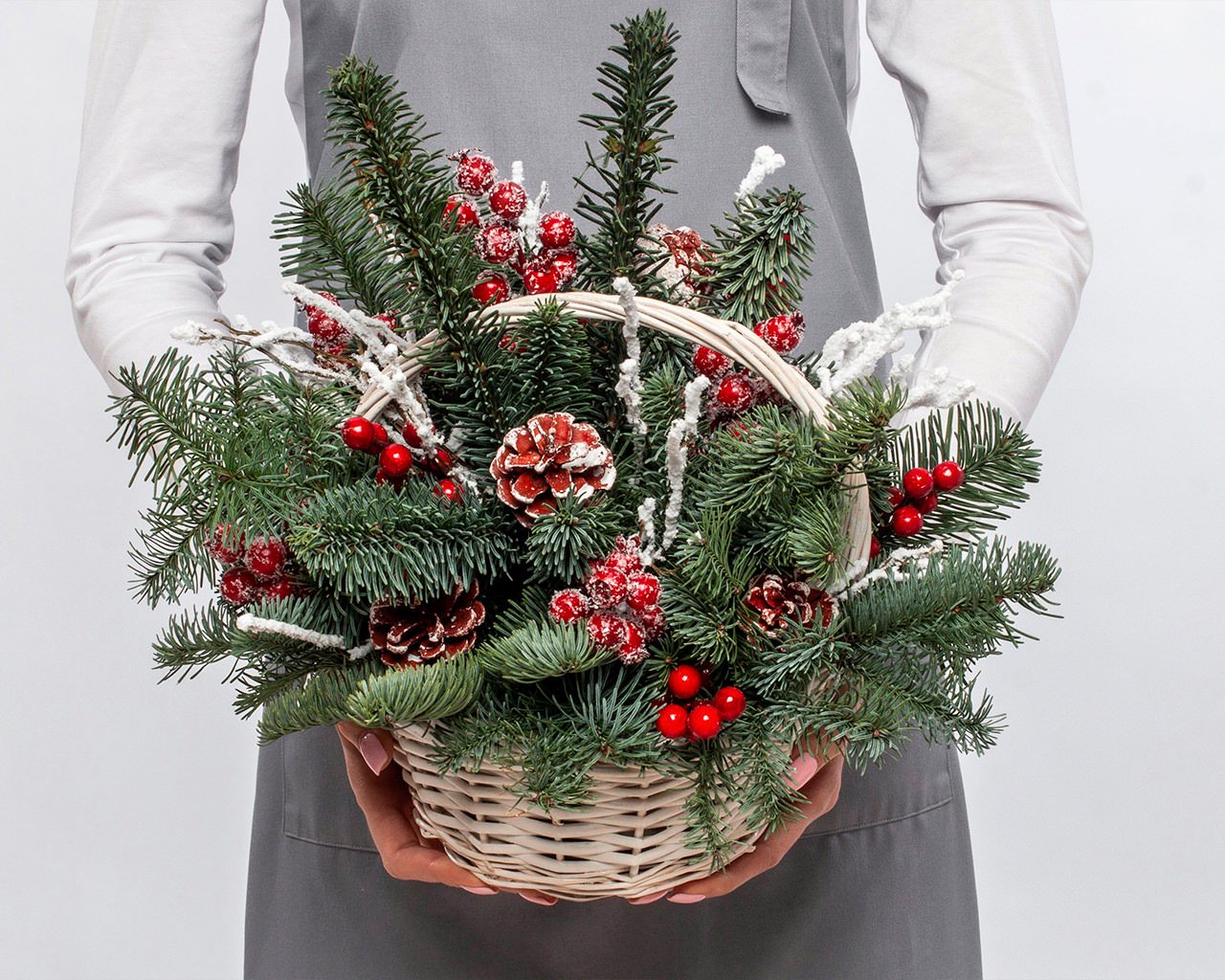 Состав: нобилис, новогодний декор, корзина, оазис.