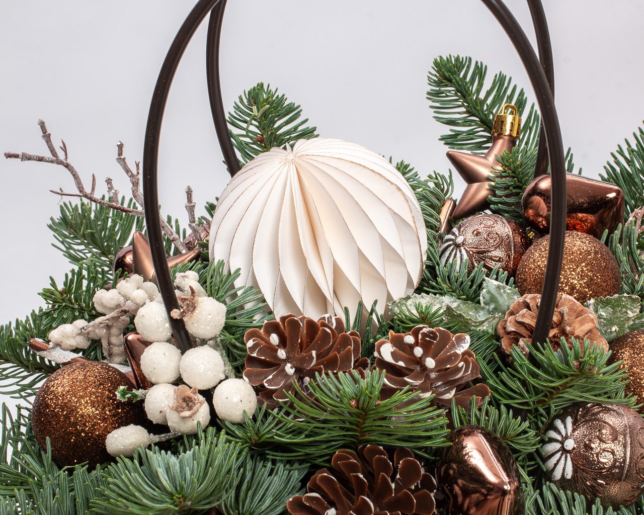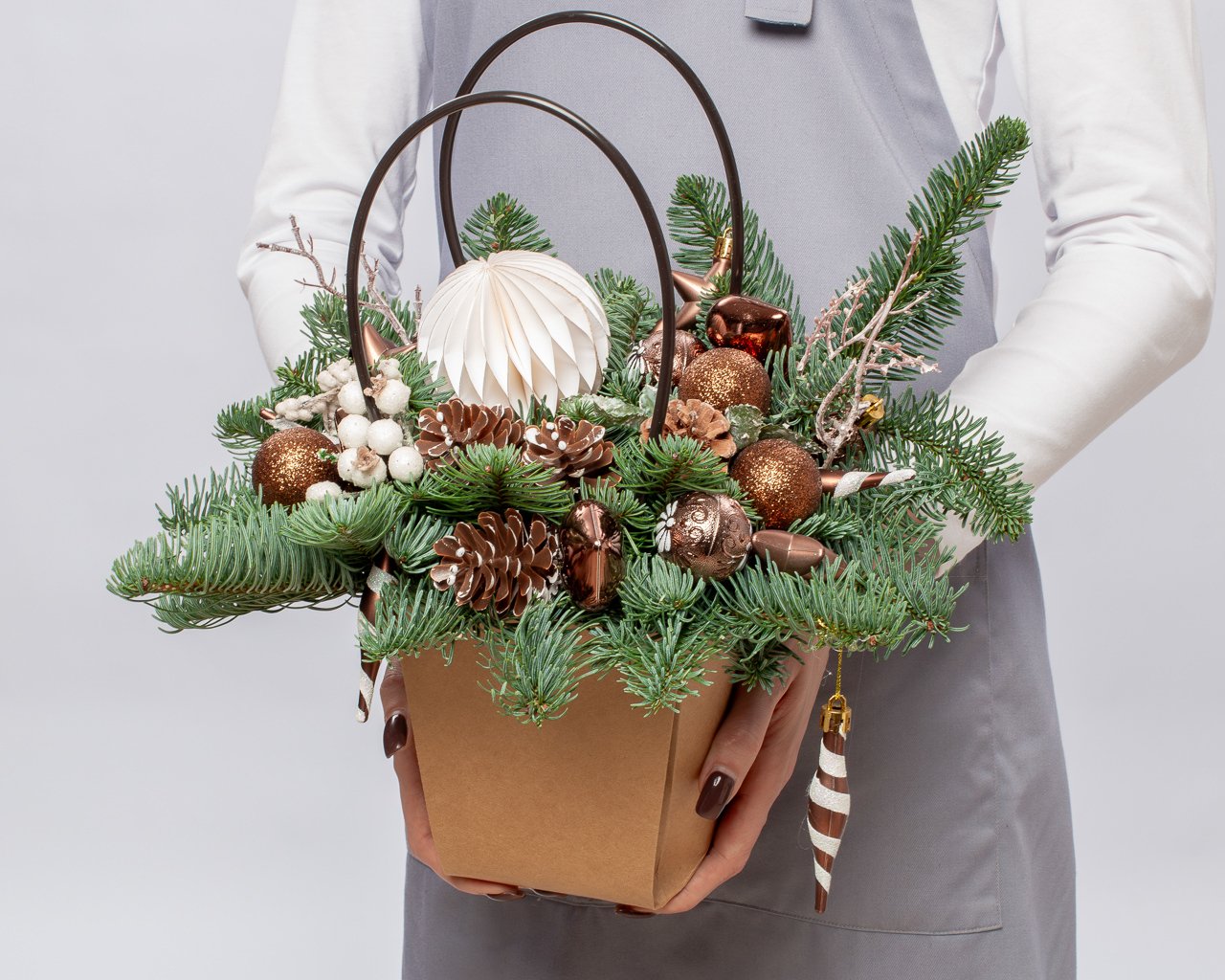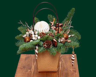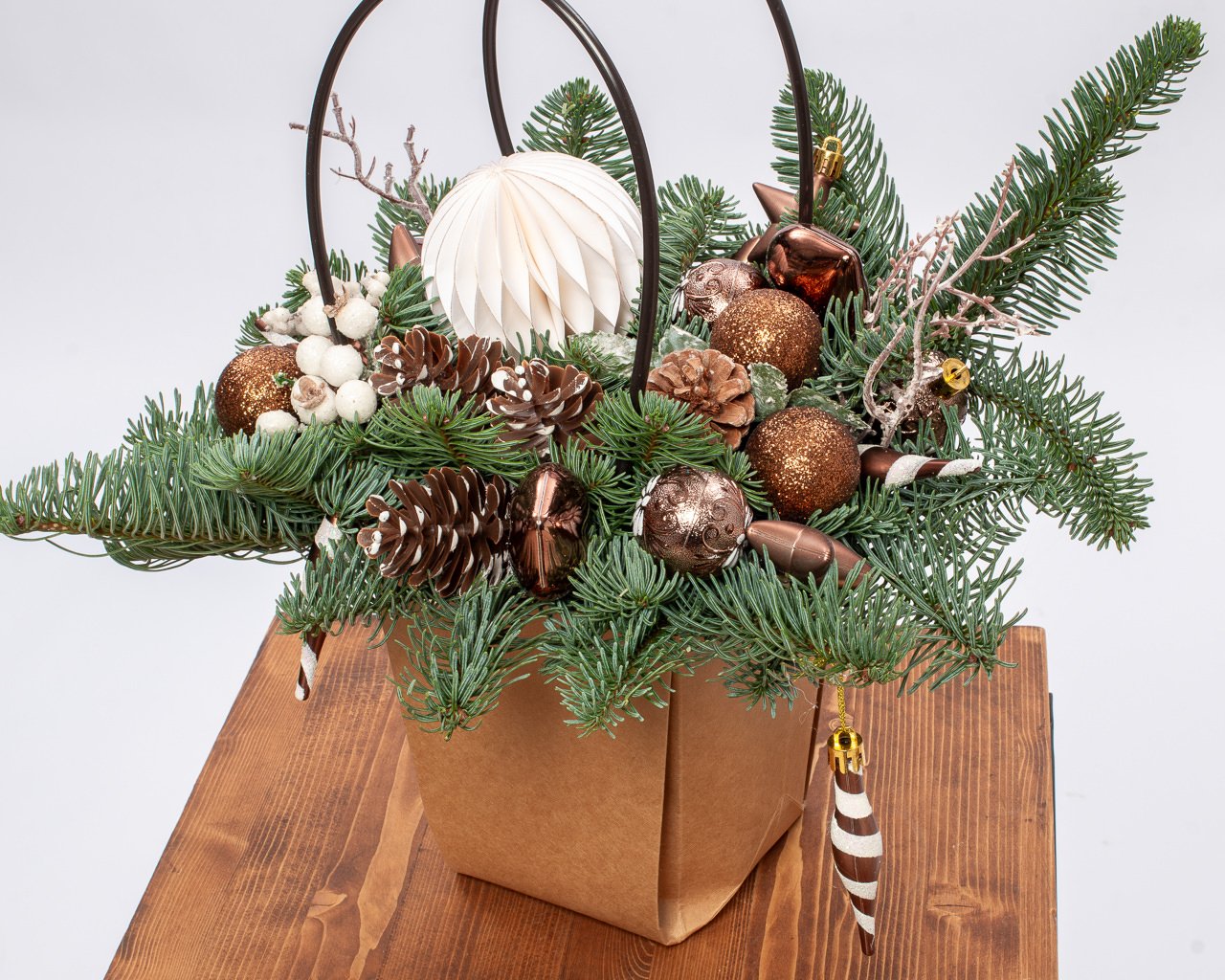 Состав: нобилис, новогодний декор, сумка, оазис.