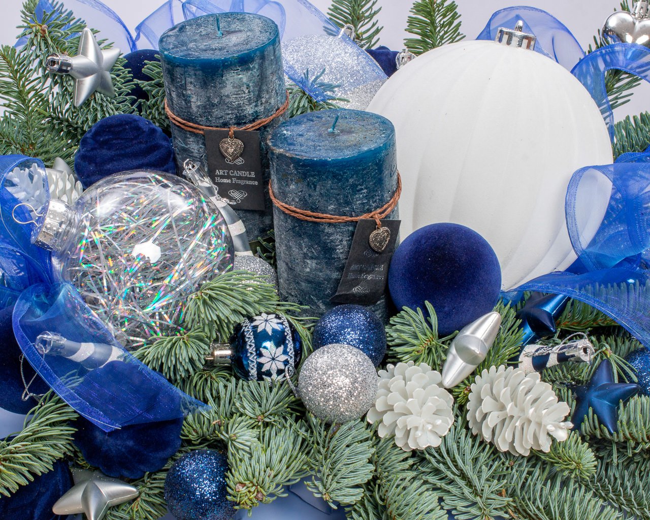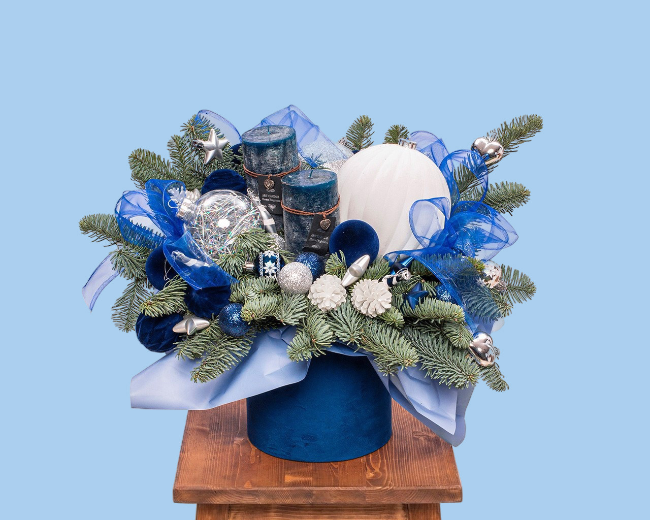Состав: нобилис, новогодний декор, свечи, шляпная коробка, оазис.
