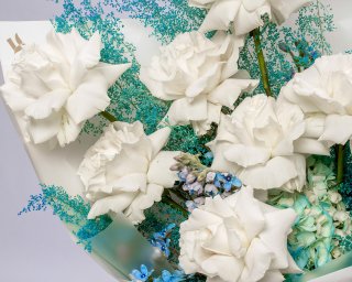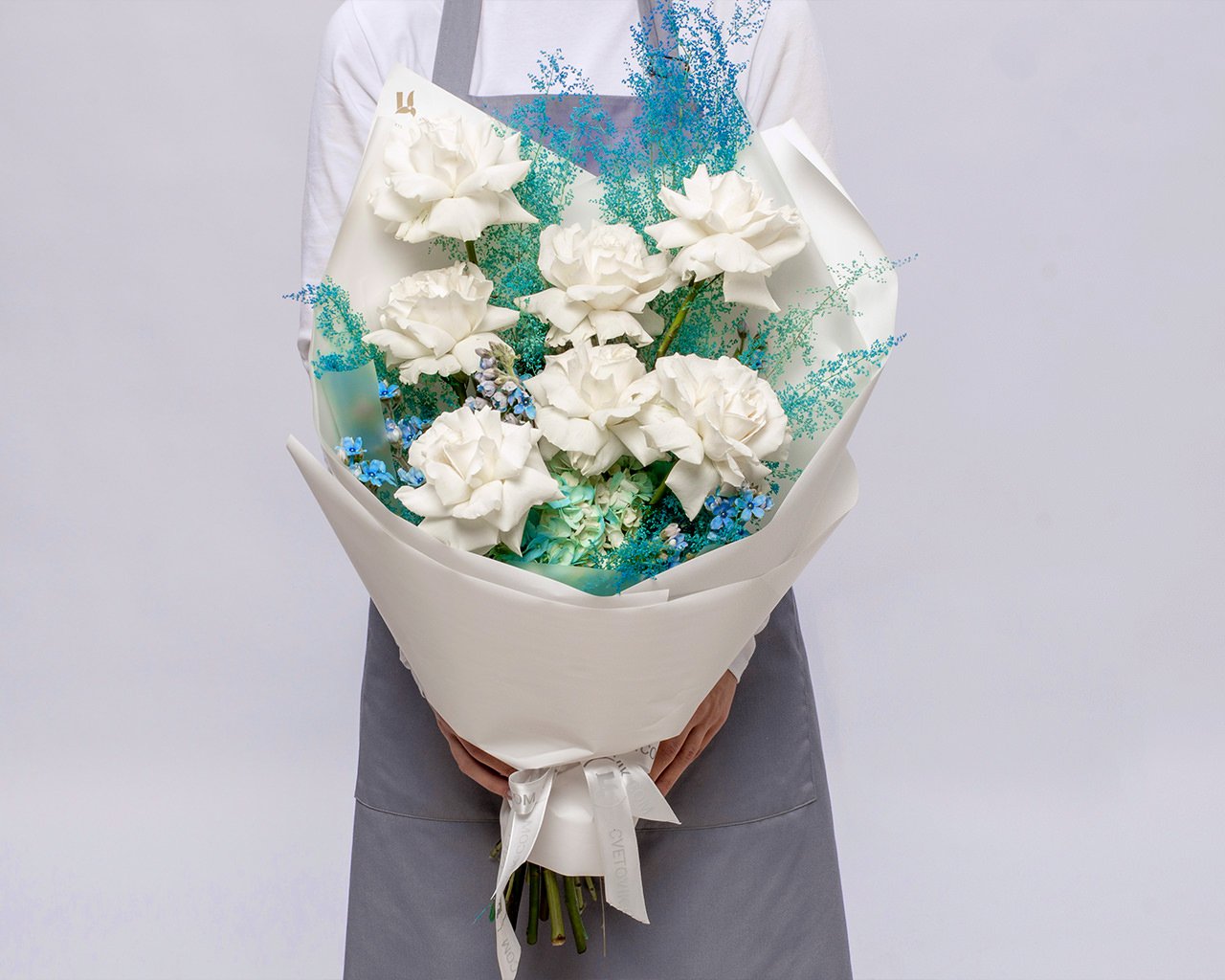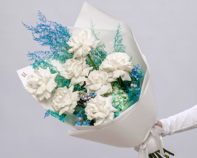 Состав: гортензия 1 шт., роза Премиум 7 шт., твидия 7 шт., стаб.цветы банч 1 шт., пленка 2,5 шт., лента 2 шт.