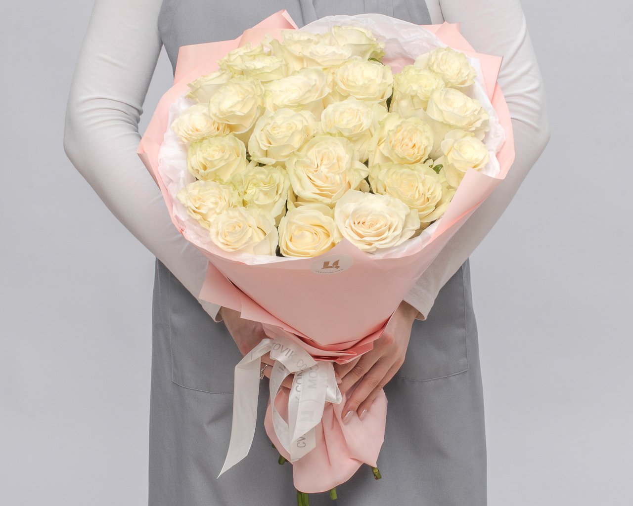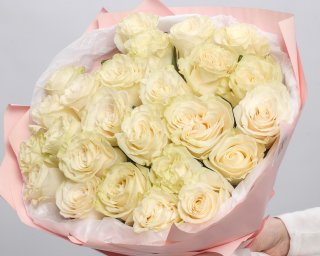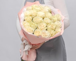 Белые розы – символ чистоты и искренности. Светлое оформление подчеркнет нежность и белизну цветов, помогая вам выразить свои чувства. Прекрасный подарок для близкого человека.